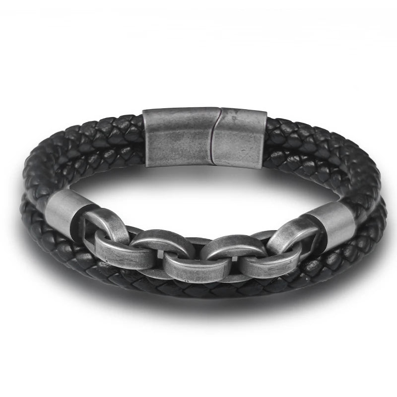 Podkreśl swój indywidualny styl z elegancką, męską bransoletką wykonaną z wysokiej jakości naturalnej skóry i stali nierdzewnej. Jej pleciona konstrukcja, ozdobne koraliki i podwójne zapięcie bezpieczeństwa (double-safety-clasps) sprawiają, że ten dodatek nie tylko świetnie wygląda, ale też zapewnia wygodę i trwałość noszenia przez wiele sezonów.