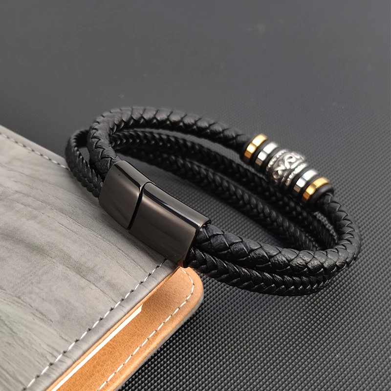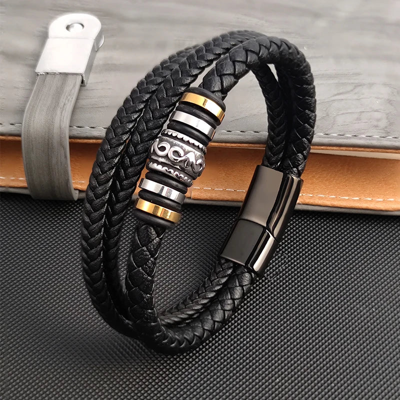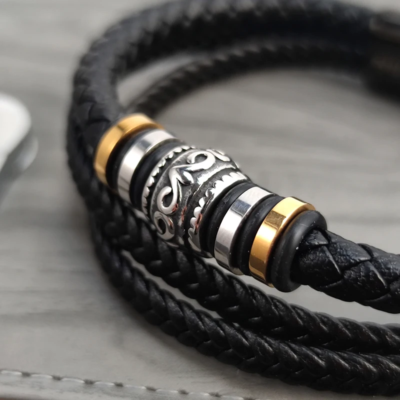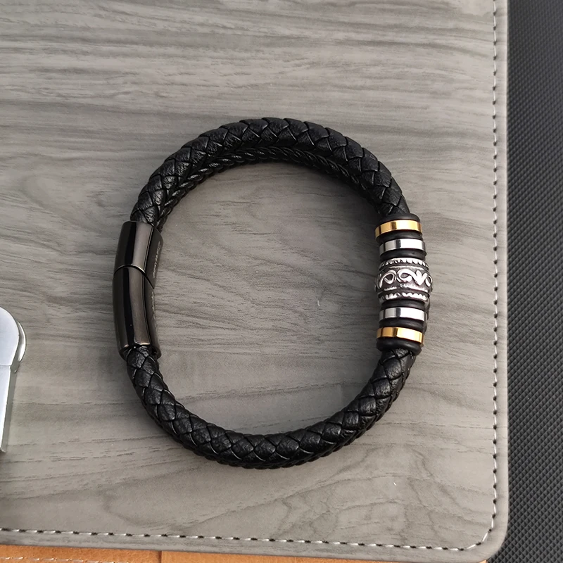 Podkreśl swój indywidualny styl dzięki tej męskiej skórzanej bransoletce z wyrazistymi okrągłymi koralikami wykonanymi ze stali nierdzewnej i tytanu. To doskonałe połączenie surowej estetyki z elegancją, które sprawdzi się zarówno w codziennych, jak i bardziej odważnych stylizacjach. Czarna, pleciona skóra nadaje jej mocny charakter, a magnetyczne zapięcie z podwójnym zabezpieczeniem zapewnia pewność i komfort noszenia.