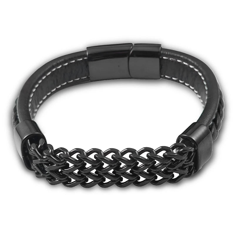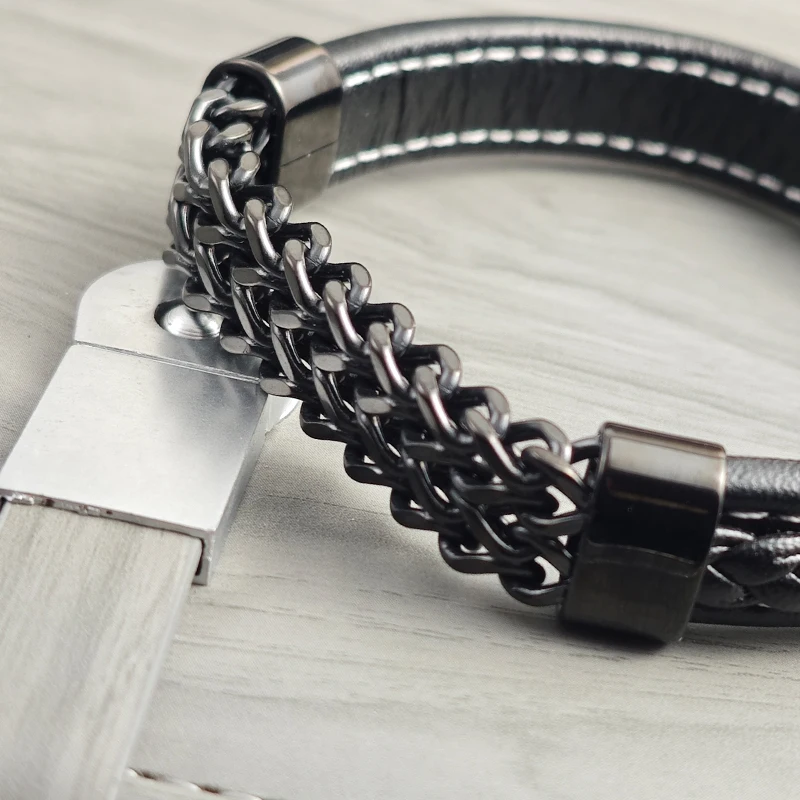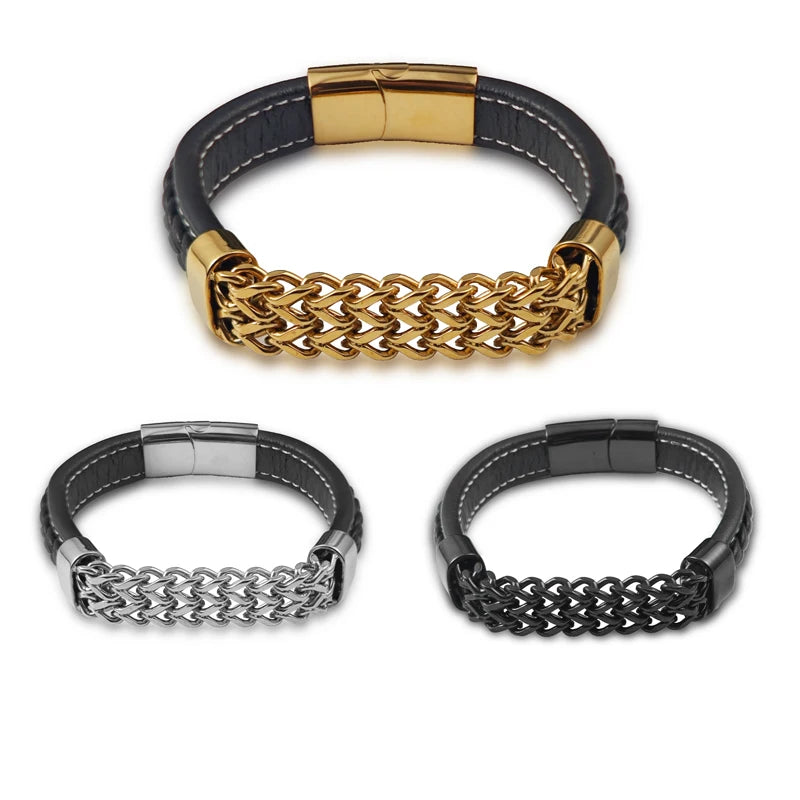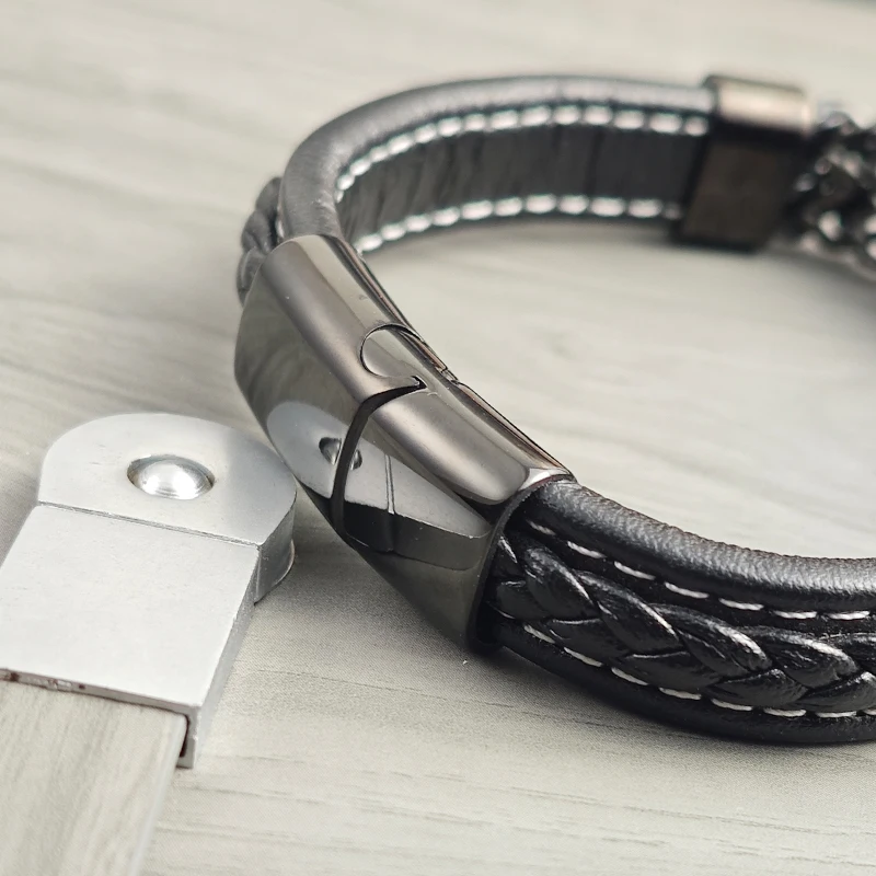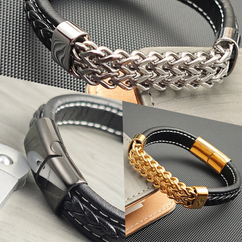 Podkreśl swój styl z wyjątkową męską bransoletką z naturalnej skóry i stali nierdzewnej 316L, stworzoną z myślą o mężczyznach, którzy cenią sobie solidność wykonania, nowoczesny design i ponadczasowy charakter biżuterii. Wykonana z połączenia wysokogatunkowej skóry oraz trwałej stali nierdzewnej, ta męska bransoletka skórzana dostępna jest w trzech klasycznych wariantach kolorystycznych: czarnym, złotym i srebrnym. Wyposażona w magnetyczne zapięcie typu double-safety-clasps, gwarantuje bezpieczeństwo i komfort noszenia. To połączenie stylu punk, rock, klasyki i nowoczesności sprawia, że bransoletka pasuje zarówno do codziennego noszenia, jak i na specjalne okazje.