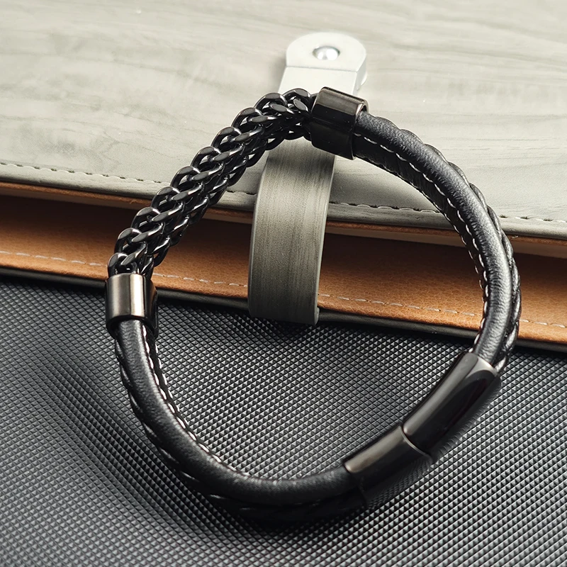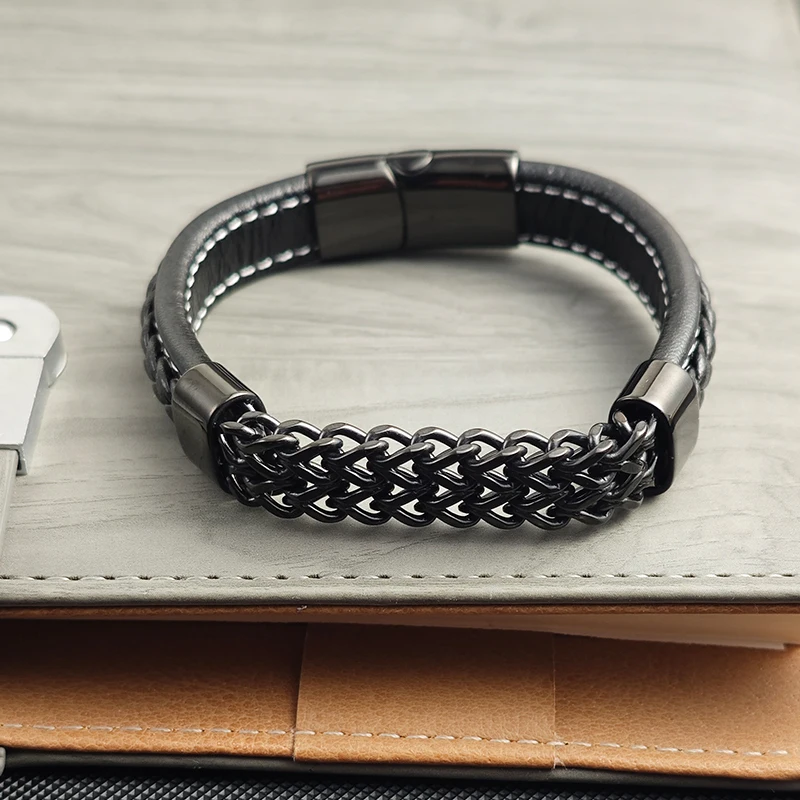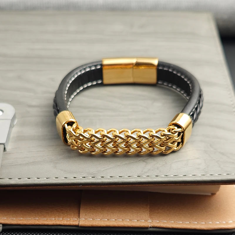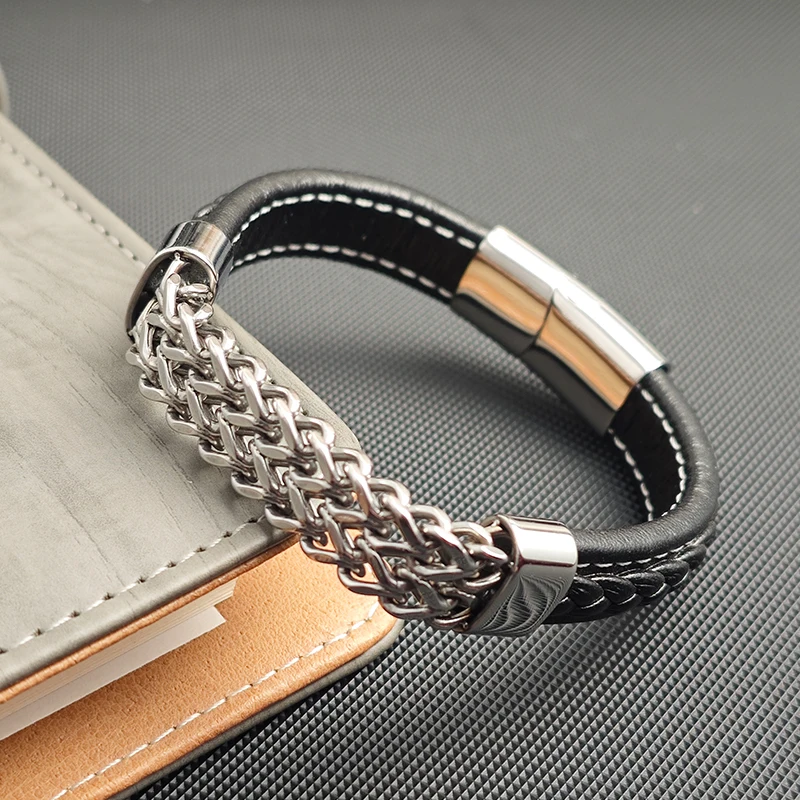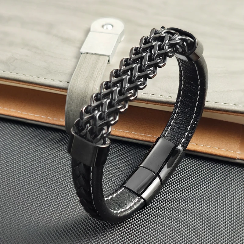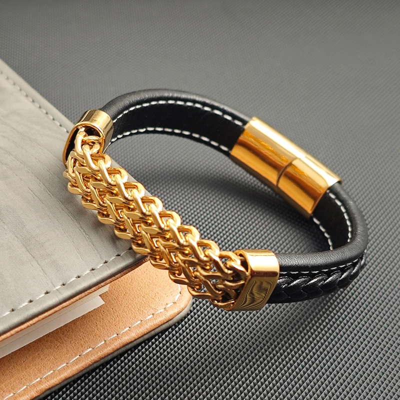 Podkreśl swój styl z wyjątkową męską bransoletką z naturalnej skóry i stali nierdzewnej 316L, stworzoną z myślą o mężczyznach, którzy cenią sobie solidność wykonania, nowoczesny design i ponadczasowy charakter biżuterii. Wykonana z połączenia wysokogatunkowej skóry oraz trwałej stali nierdzewnej, ta męska bransoletka skórzana dostępna jest w trzech klasycznych wariantach kolorystycznych: czarnym, złotym i srebrnym. Wyposażona w magnetyczne zapięcie typu double-safety-clasps, gwarantuje bezpieczeństwo i komfort noszenia. To połączenie stylu punk, rock, klasyki i nowoczesności sprawia, że bransoletka pasuje zarówno do codziennego noszenia, jak i na specjalne okazje.