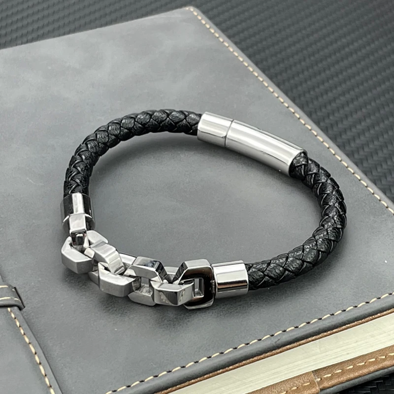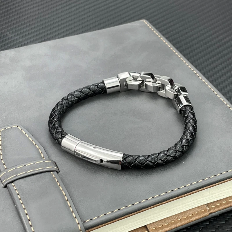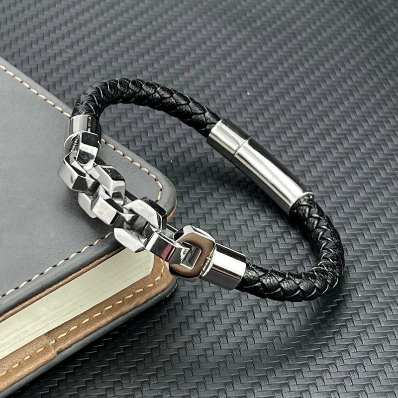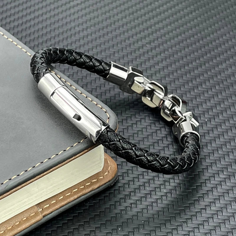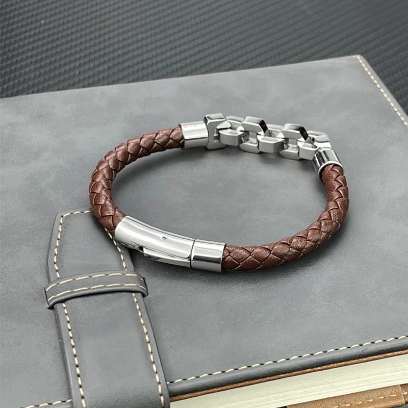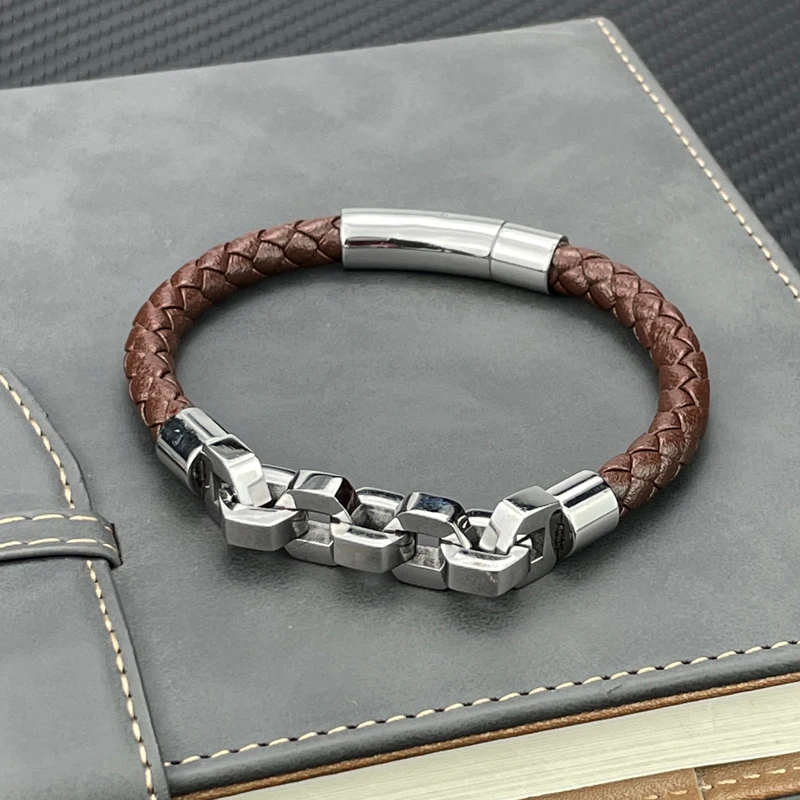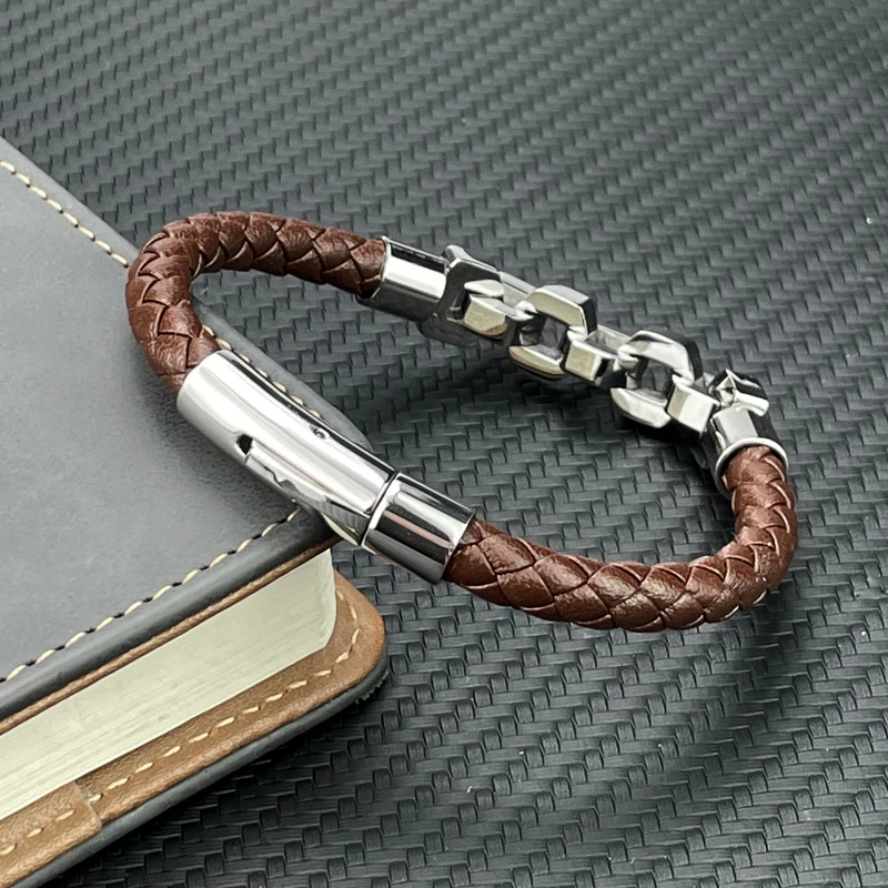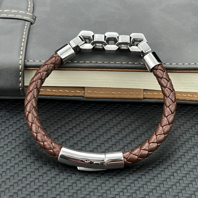 - Wysokiej jakości materiał: Bransoletka wykonana z trwałej, brązowej skóry bydlęcej oraz stali nierdzewnej odpornej na korozję.