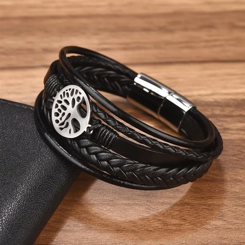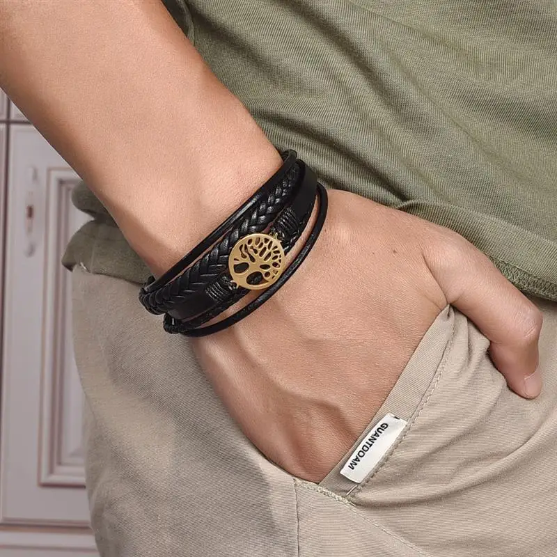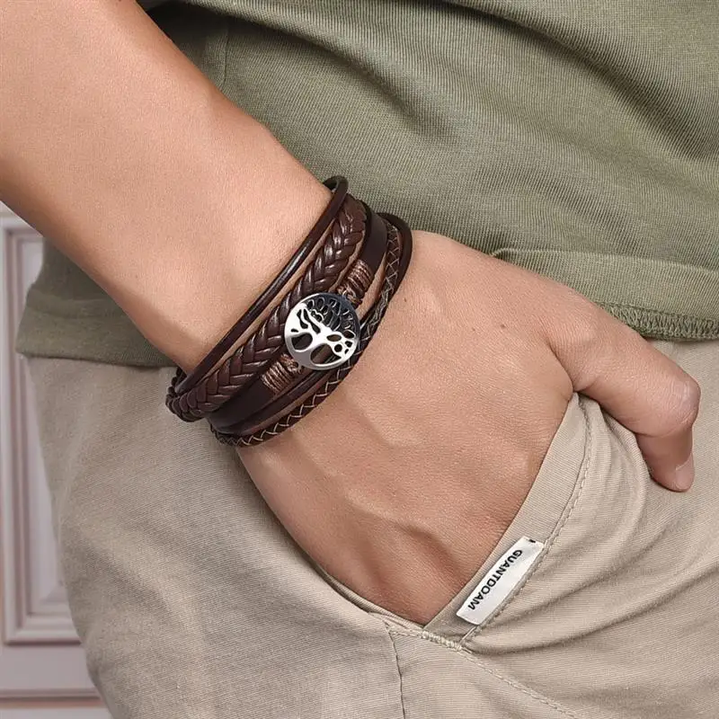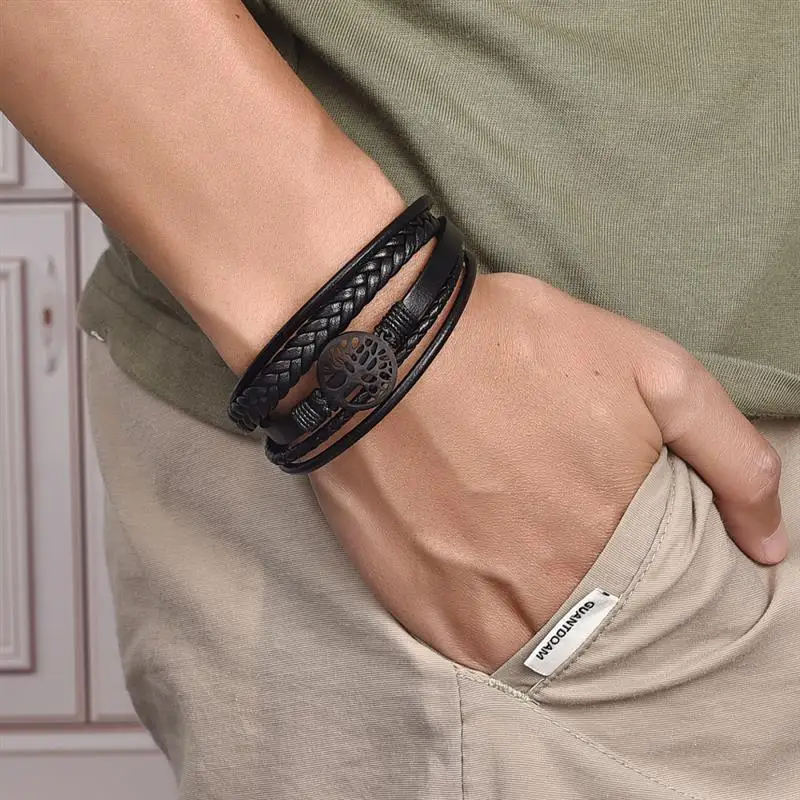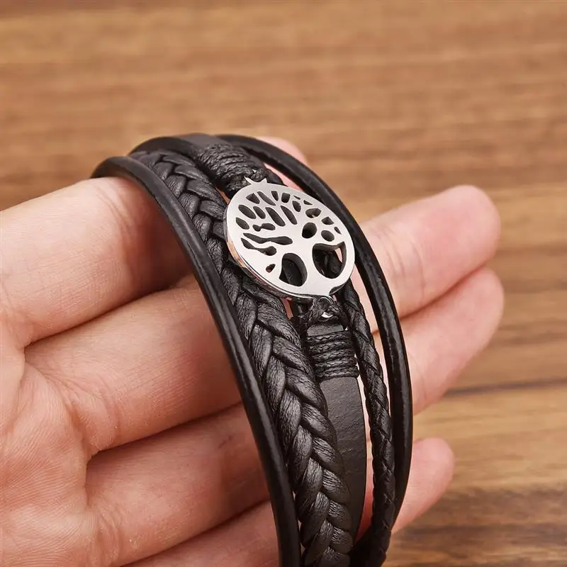 Bransoletka Męska ze Skóry i Stali Nierdzewnej z Drzewem Życia