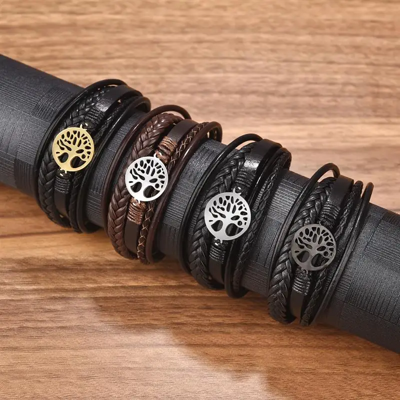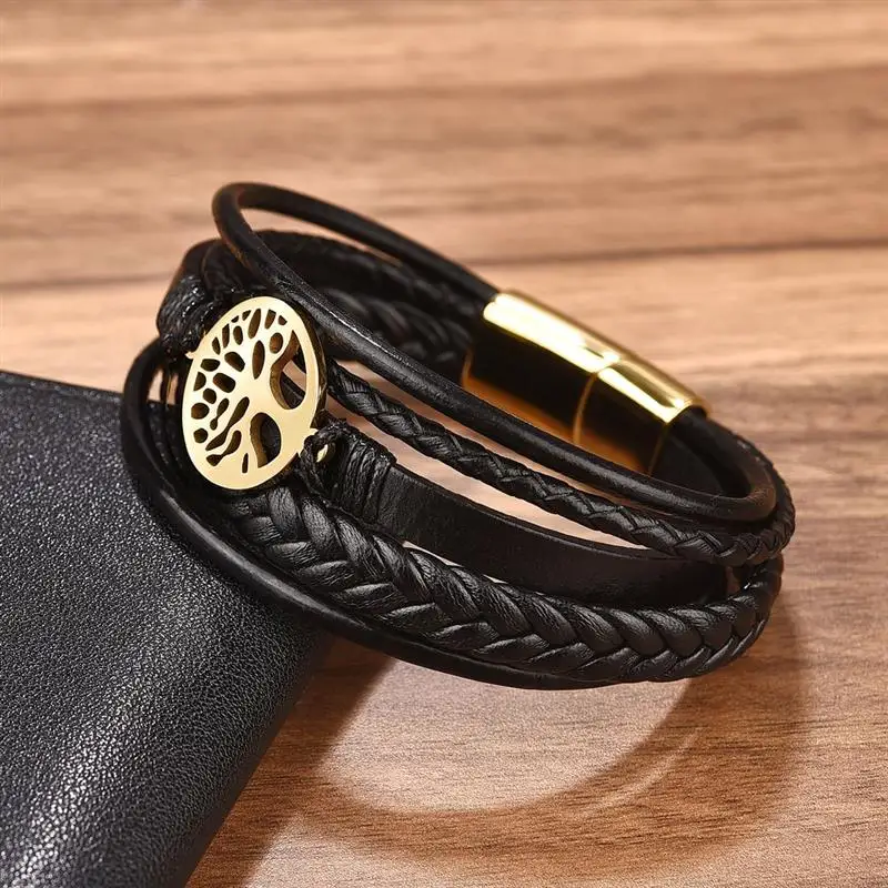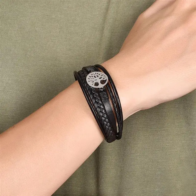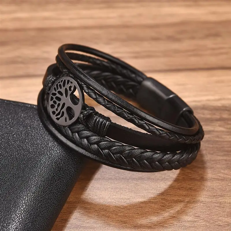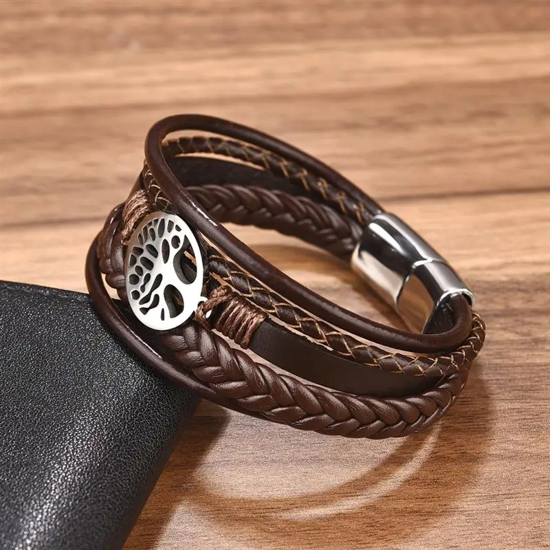 Bransoletka Męska ze Skóry i Stali Nierdzewnej z Drzewem Życia