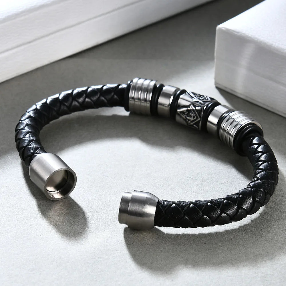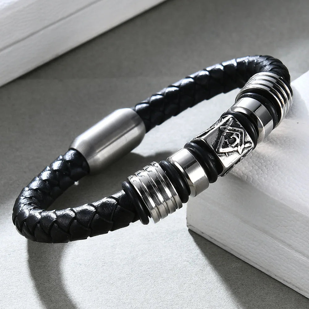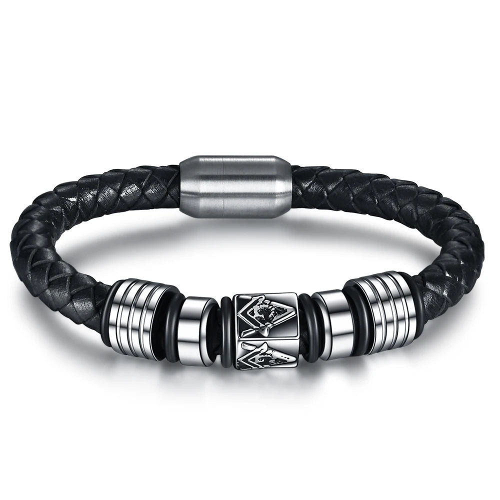 Odkryj męską bransoletkę skórzaną, która łączy nowoczesny design z ponadczasową elegancją. Wykonana z wysokiej jakości naturalnej skóry i stopu cynku, ta modna bransoletka męska to idealny wybór dla mężczyzn ceniących styl, wyrazistość i klasę. Zastosowany geometryczny wzór sprawiają, że biżuteria przyciąga wzrok i wyróżnia się na tle innych dodatków. Bransoletka została wyposażona w praktyczne magnetyczne zapięcie, które gwarantuje wygodne i szybkie zakładanie oraz trwałość noszenia. Doskonale sprawdzi się jako biżuteria na co dzień, do pracy, na spotkanie lub wieczorne wyjście. Idealny wybór dla tych, którzy poszukują oryginalnej i męskiej biżuterii ze skóry o sportowym, ale jednocześnie szykownym charakterze