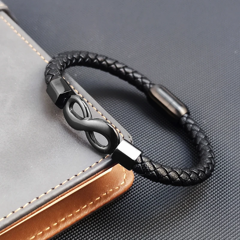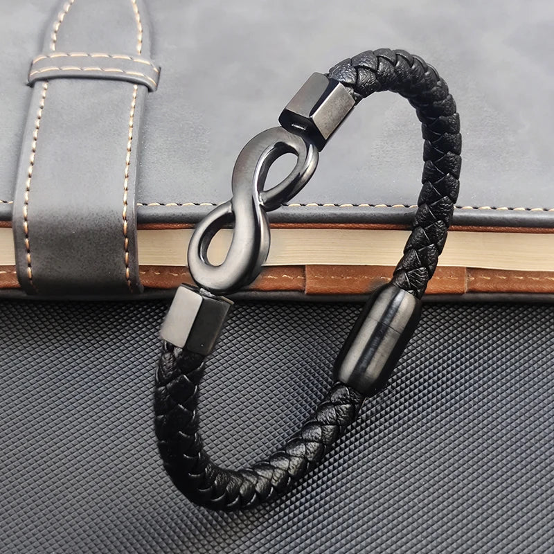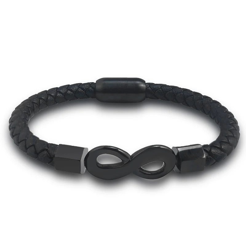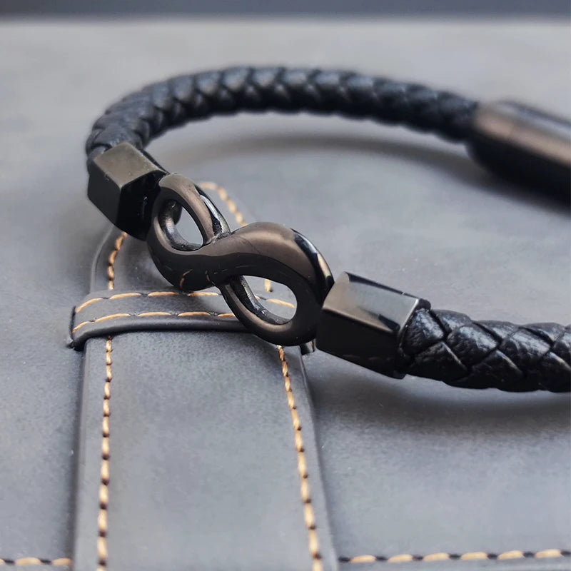 Wyraź siebie dzięki tej eleganckiej męskiej bransoletce wykonanej z naturalnej, ręcznie plecionej skóry. Jej centralnym punktem jest symbol nieskończoności (∞) – znak wieczności, lojalności i niezłomnej siły. To idealny dodatek dla mężczyzny, który ceni symboliczne znaczenie biżuterii i chce wyróżnić się w stylowy, nienachalny sposób.