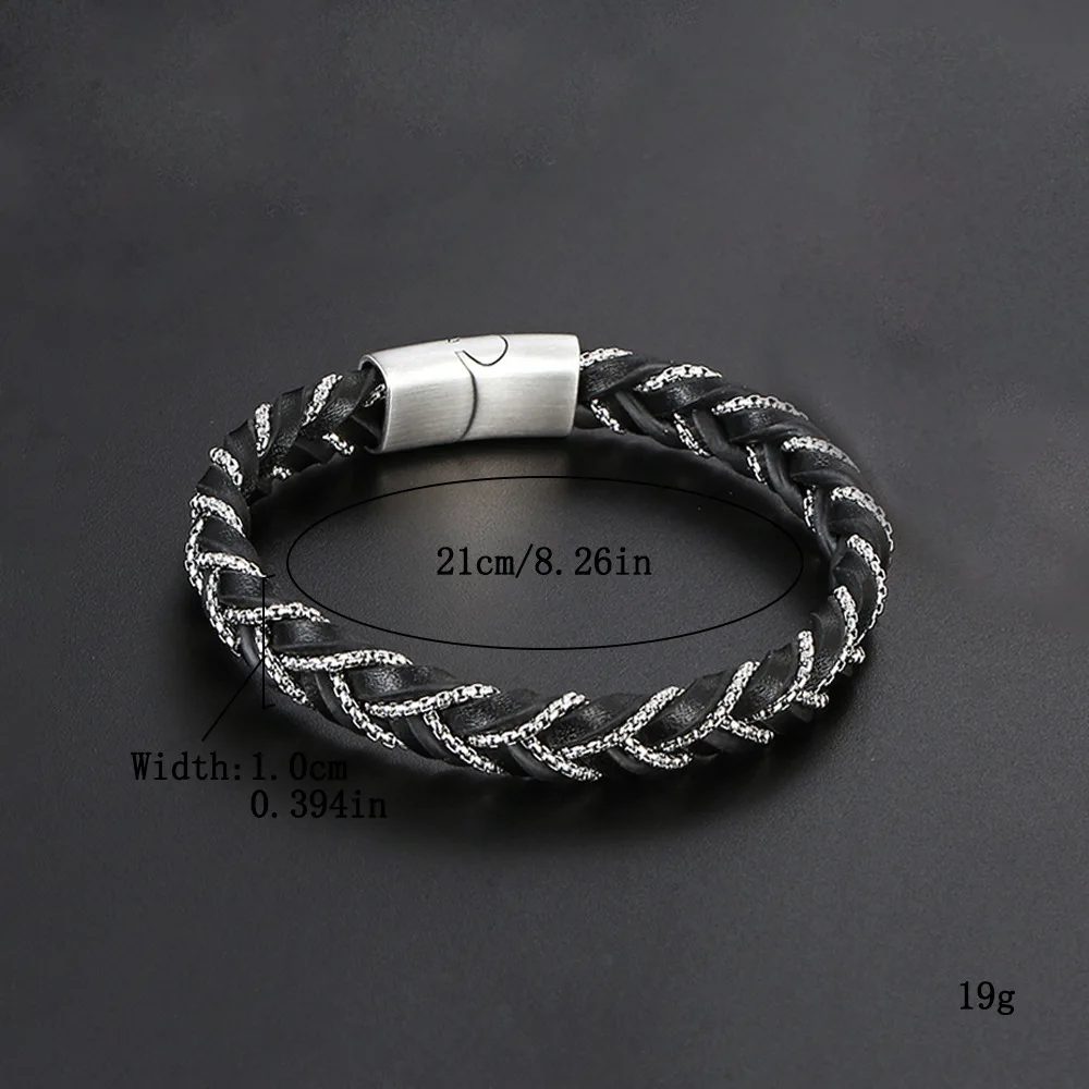 Dodaj elegancki akcent do swojej stylizacji z męską bransoletką z wysokiej jakości plecionej skóry i stali nierdzewnej. Starannie wykonana, łączy w sobie klasyczny styl z nowoczesną funkcjonalnością, zapewniając wygodę noszenia na co dzień i od święta.