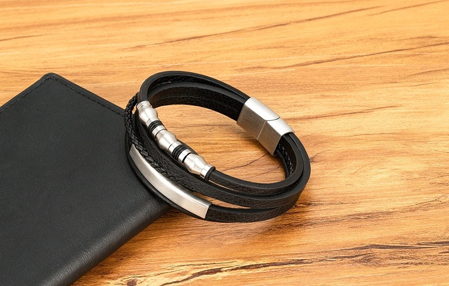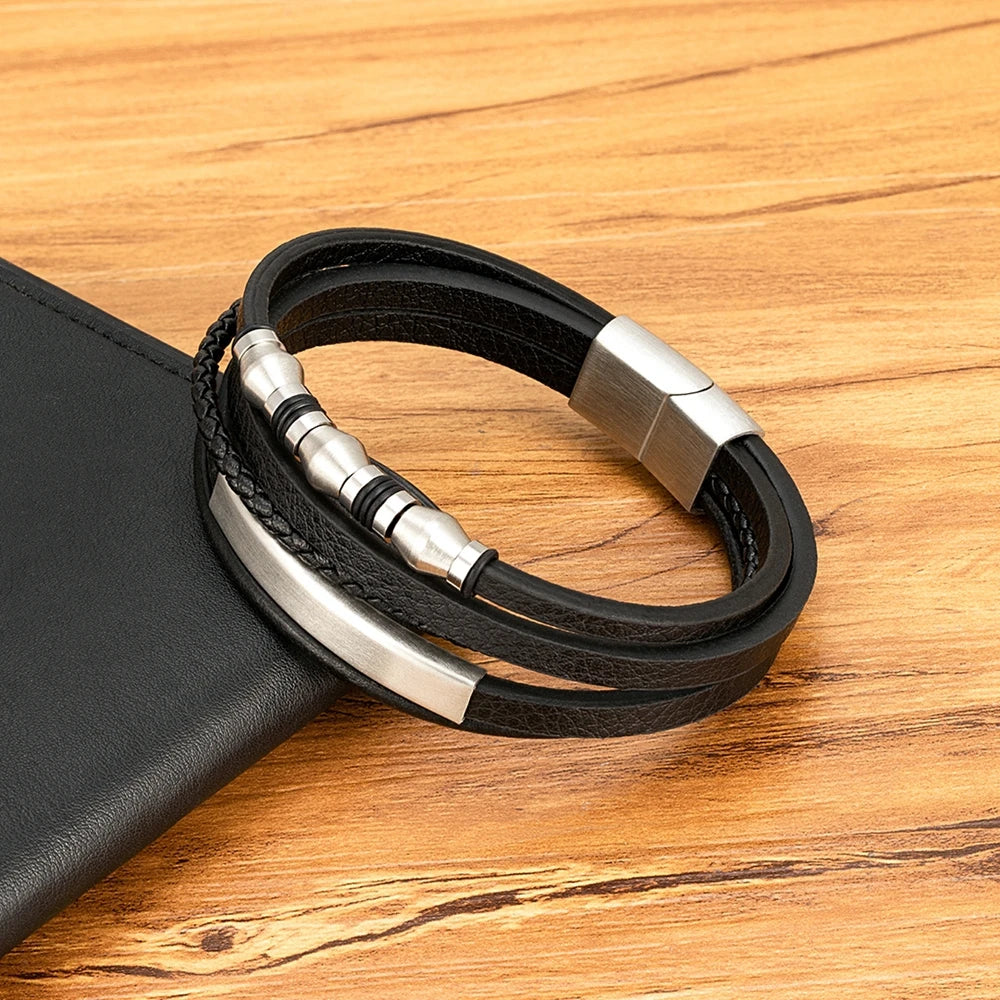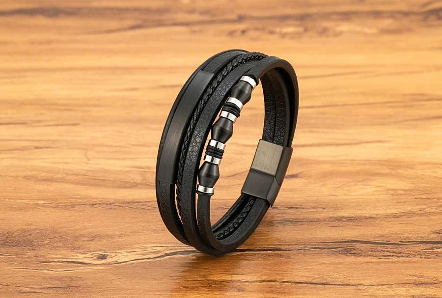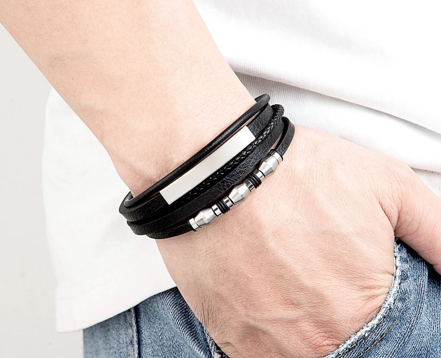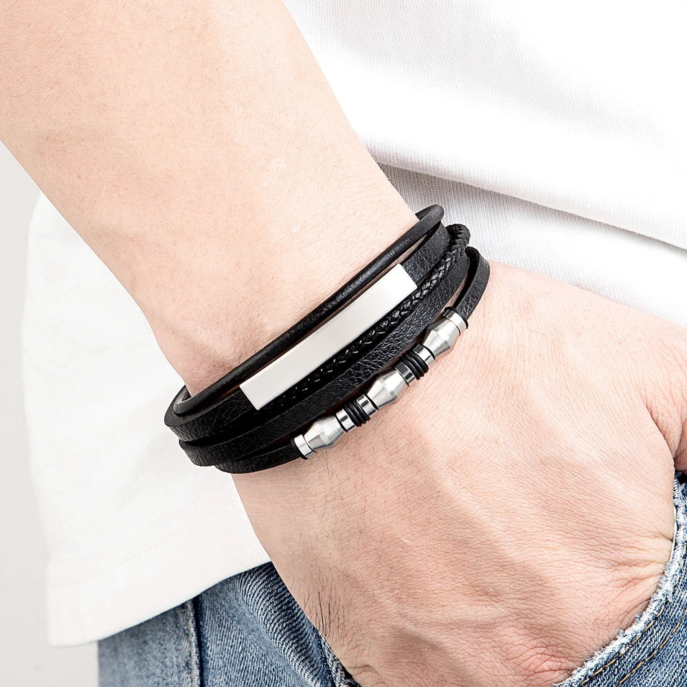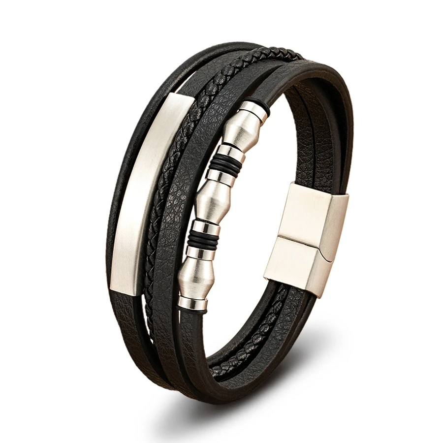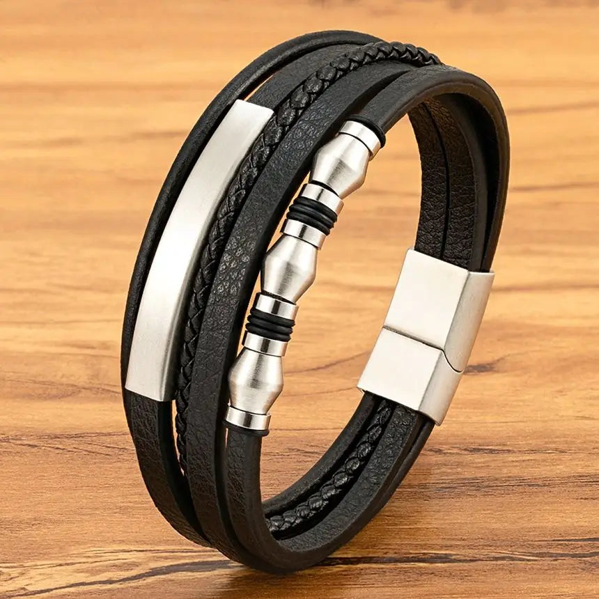 Odkryj wyjątkową elegancję dzięki męskiej bransoletce ze skóry naturalnej i stali nierdzewnej. Starannie wykonana z wysokiej jakości materiałów, ta stylowa bransoletka łączy w sobie wielowarstwowy design z geometrycznym wzorem, tworząc modny, a zarazem ponadczasowy dodatek dla każdego mężczyzny.