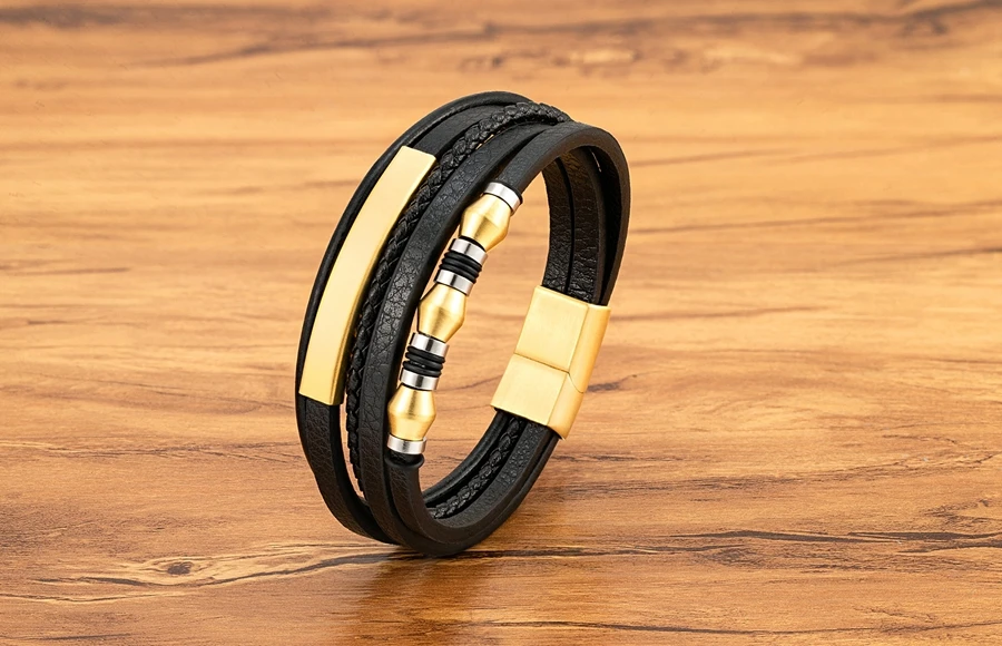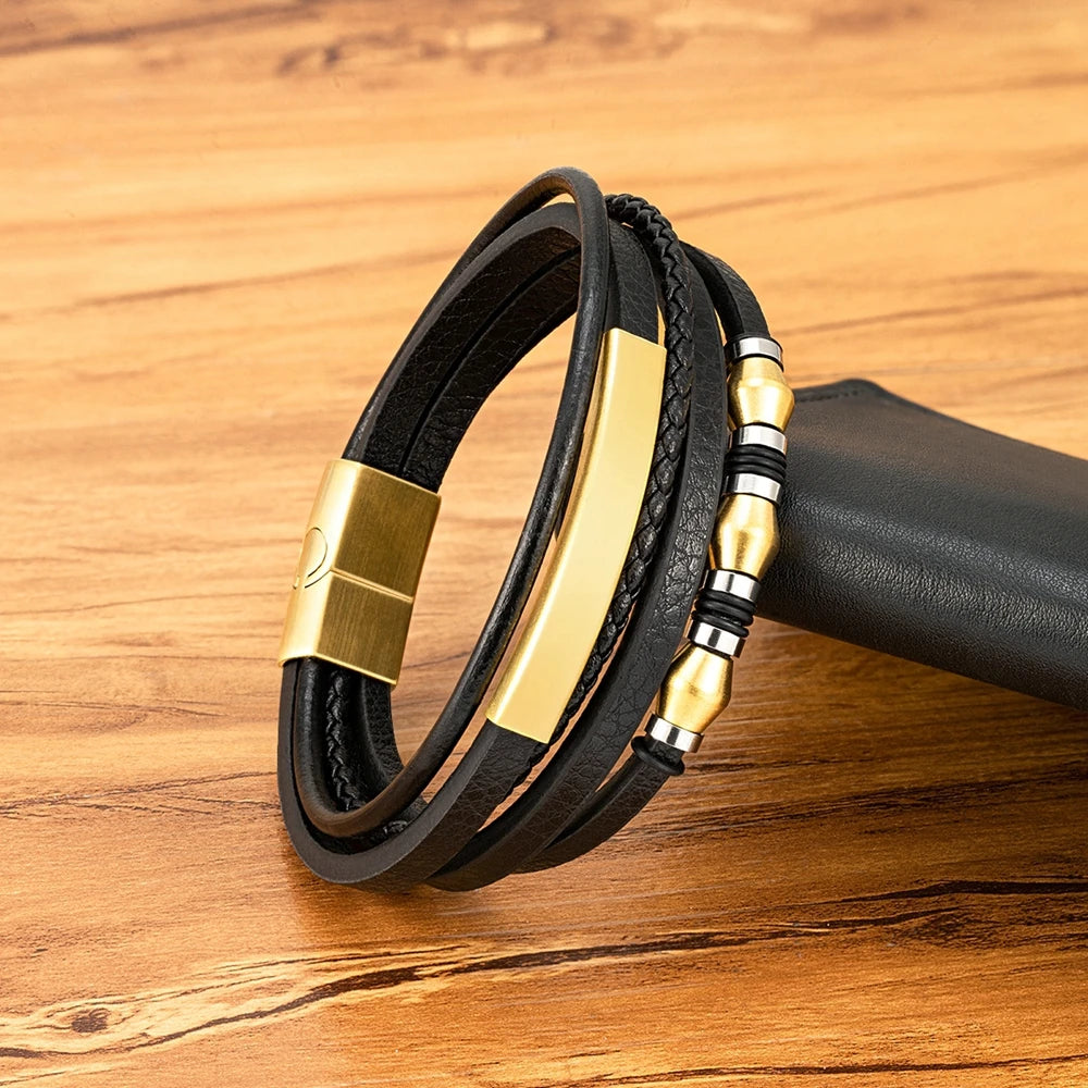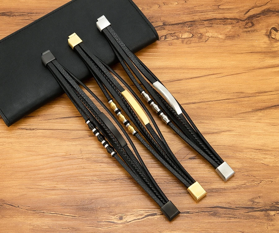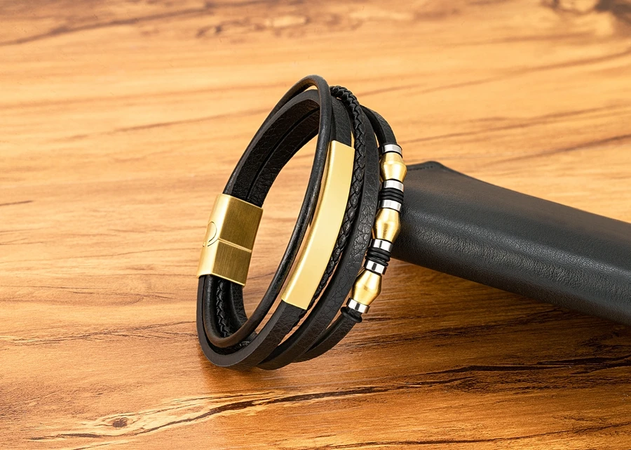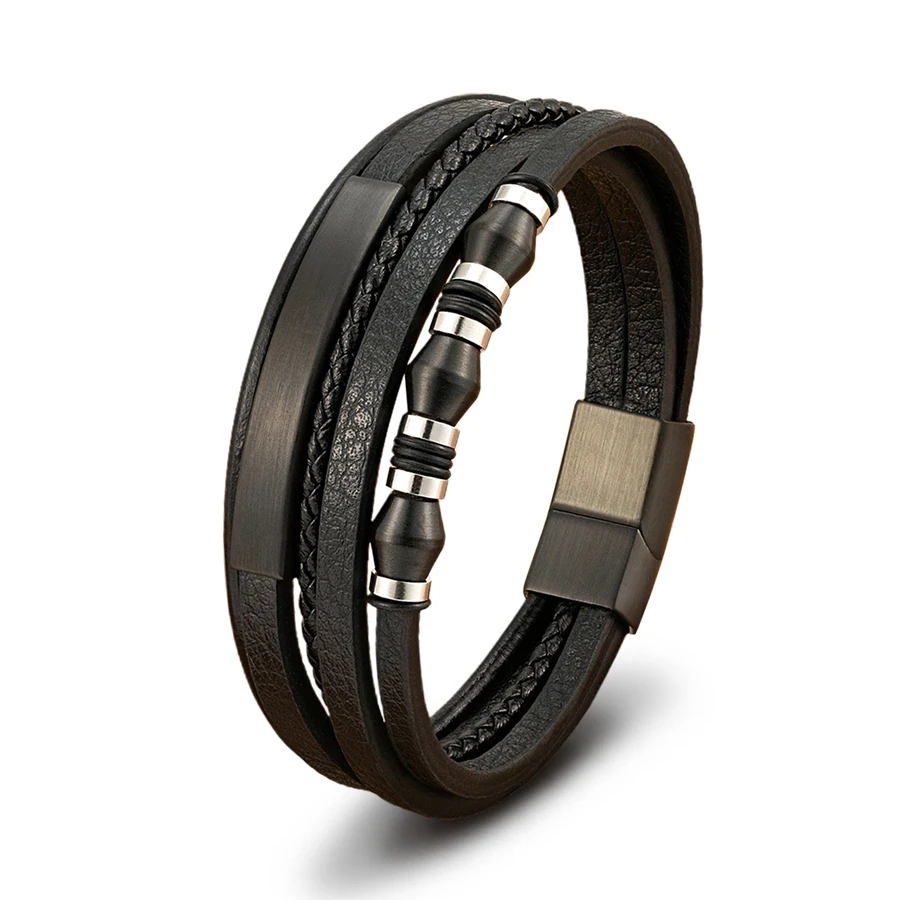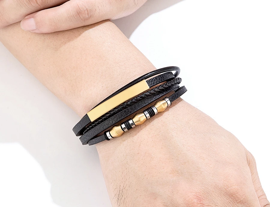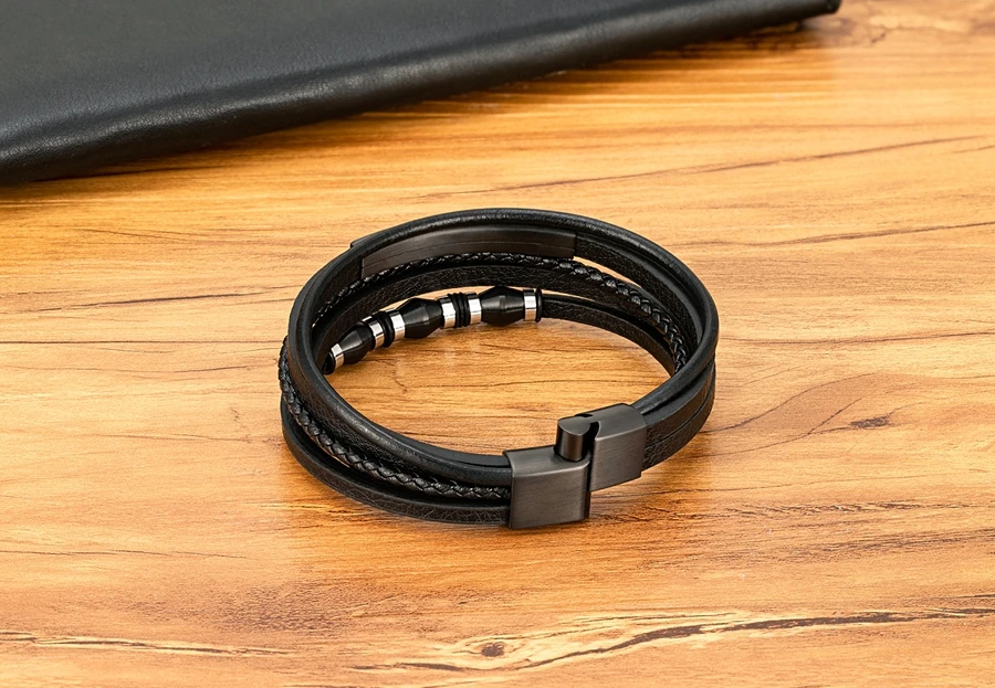 Odkryj wyjątkową elegancję dzięki męskiej bransoletce ze skóry naturalnej i stali nierdzewnej. Starannie wykonana z wysokiej jakości materiałów, ta stylowa bransoletka łączy w sobie wielowarstwowy design z geometrycznym wzorem, tworząc modny, a zarazem ponadczasowy dodatek dla każdego mężczyzny.