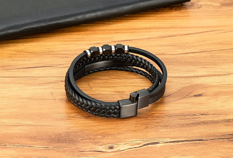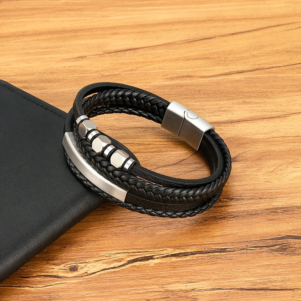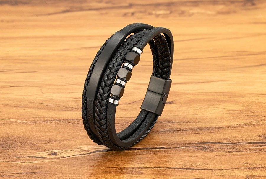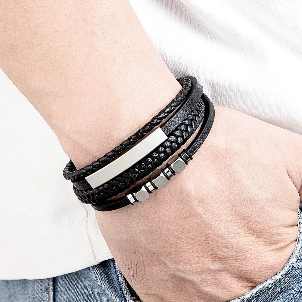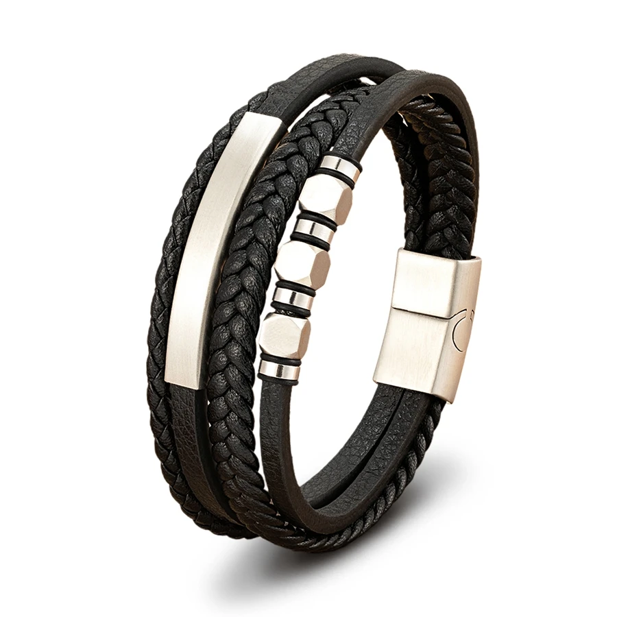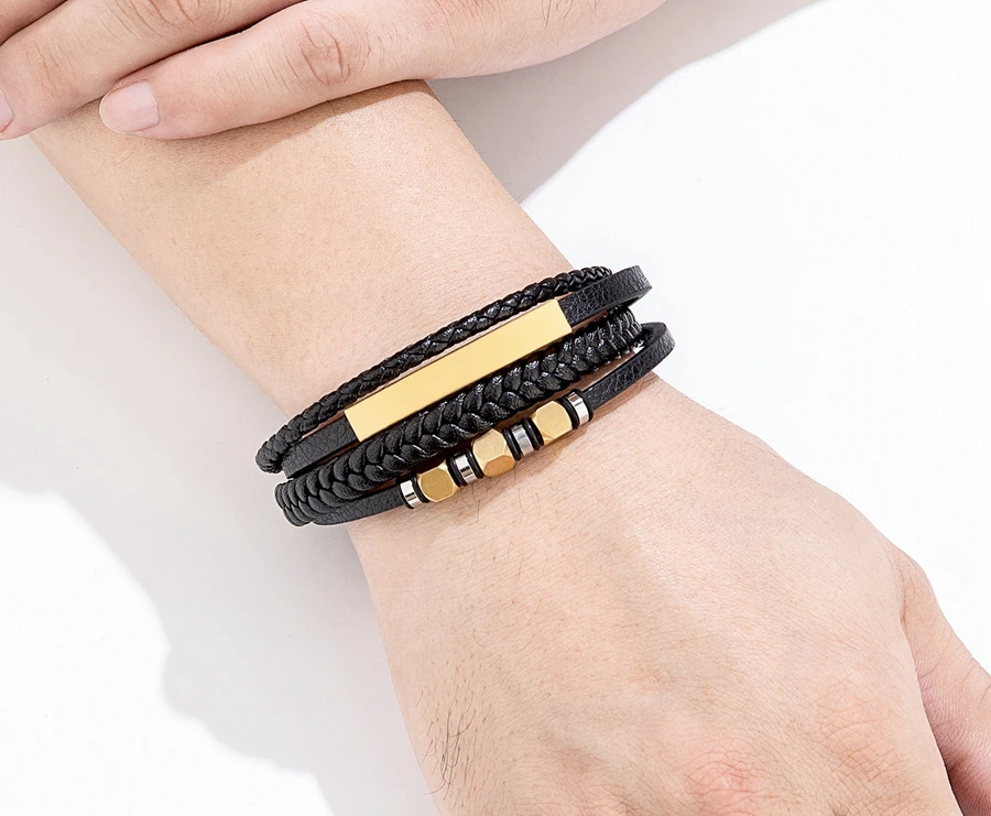 Dodaj charakteru każdej stylizacji dzięki eleganckiej bransoletce męskiej ze skóry naturalnej i stali nierdzewnej. To wyjątkowe połączenie klasy i męskiej energii – idealne dla mężczyzn ceniących elegancką biżuterię o wyrazistym charakterze. Bransoletka została starannie zaprojektowana z myślą o estetyce i wygodzie noszenia. Dzięki wielowarstwowemu skórzanemu splotowi i dekoracyjnym elementom ze stali nierdzewnej w różnych kolorach, świetnie komponuje się z zegarkiem, garniturem lub stylizacją casualową.