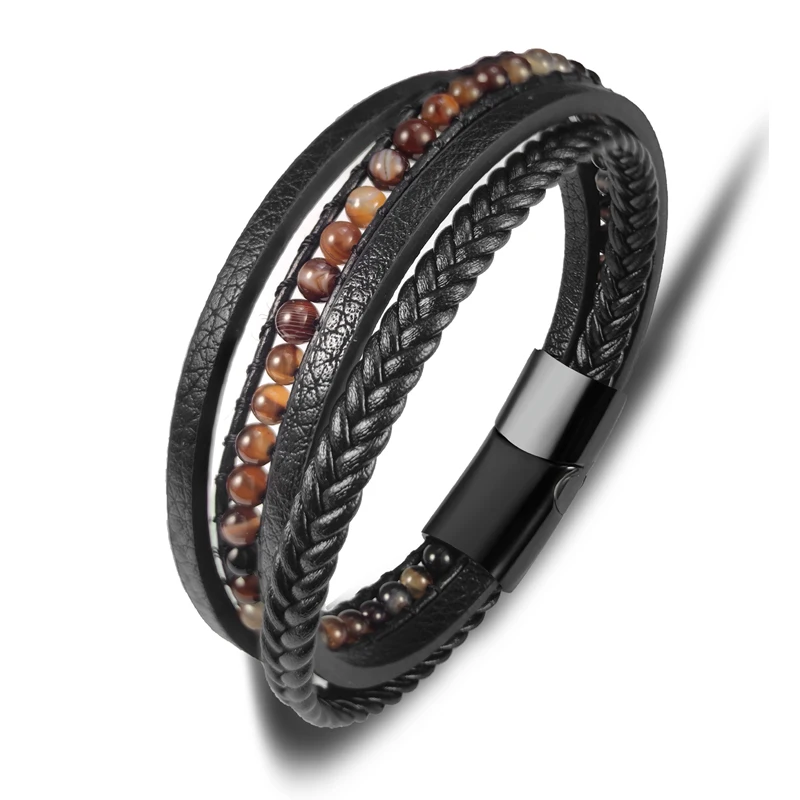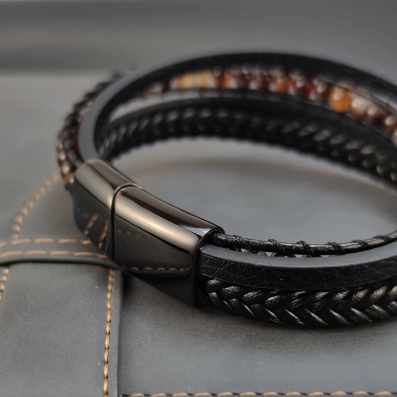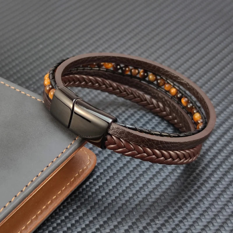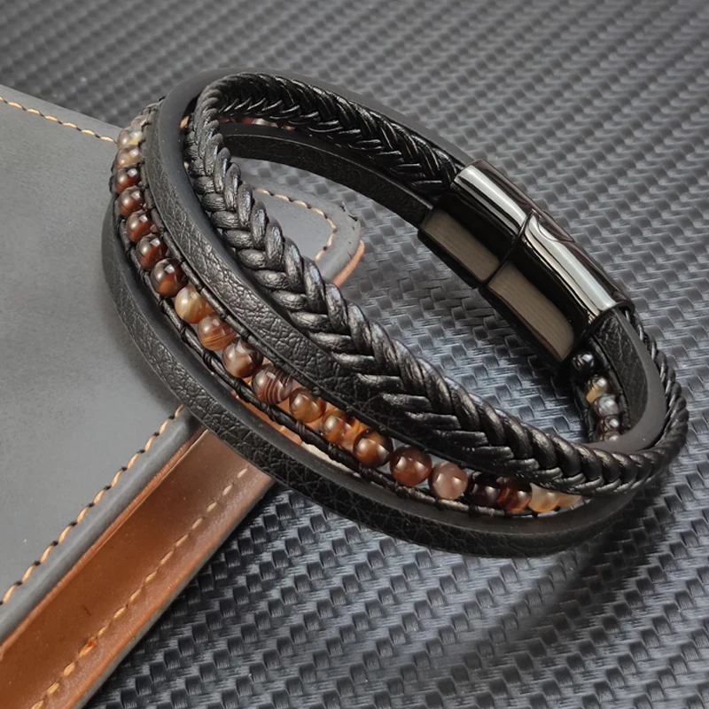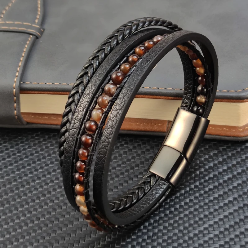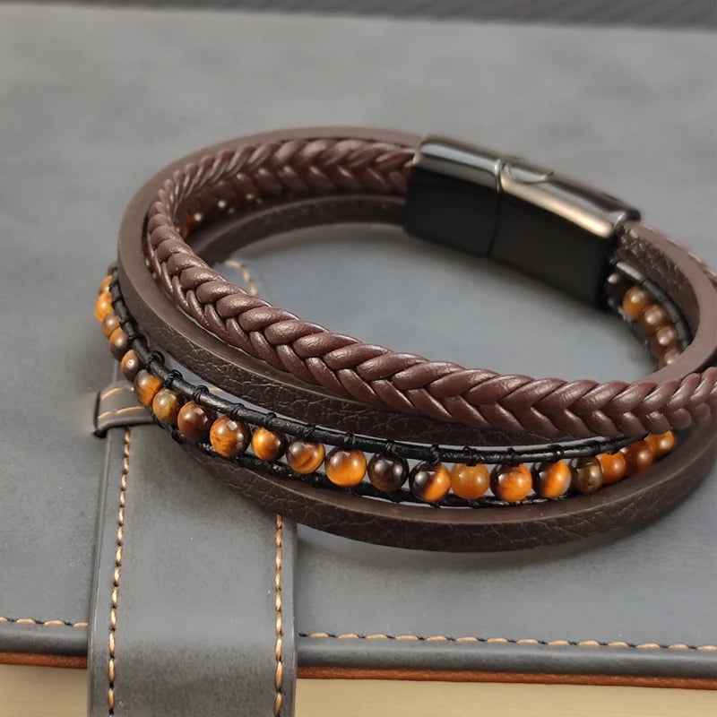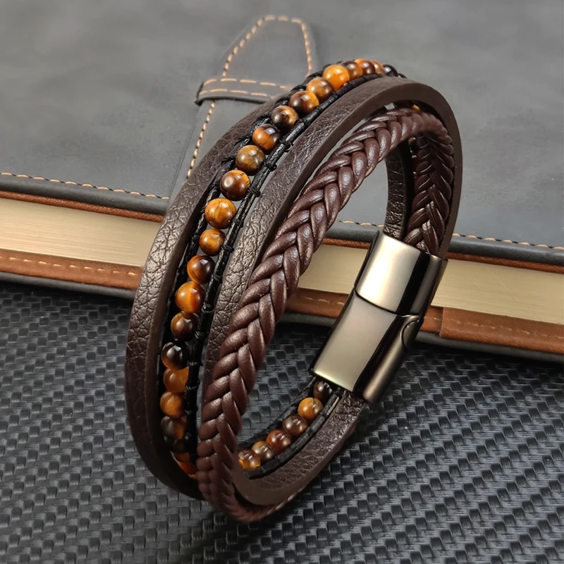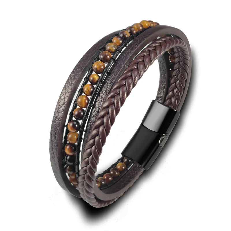 Wielowarstwowa męska bransoletce z kamieni Tygrysiego Oka wykonana z wysokiej jakości skóry naturalnej, stali nierdzewnej oraz kamieni półszlachetnych, ta bransoletka to doskonały wybór dla mężczyzn ceniących styl vintage, rockowy pazur oraz elegancki, ponadczasowy wygląd.